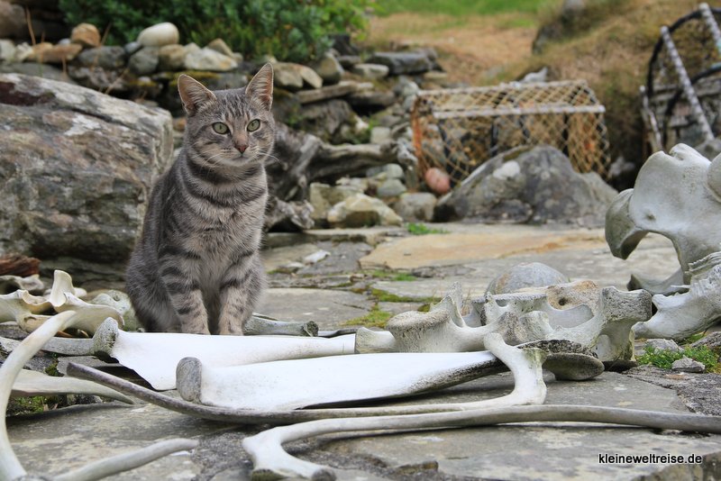 Die Katze sitzt zwischen Walknochen und beobachtet uns, wie wir durch die Ausstellung des einfachen armen Lebens stapfen. Ihr scheint es heute gut zu gehen.