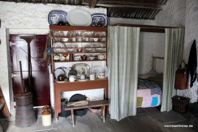 Margret zeigt uns die Cottages mit den Strohdächern die sie konserviert und als Museum ausgebaut hat. Sie sind mit originalen Möbeln eingerichtet. In einem Haus hat die ganze Familie gelebt, in der Küche steht ein viel zu kurzes Bett mit Vorhang. „Darin haben zwei Menschen geschlafen, die waren aber nicht kleiner als wir heute sind. Sie haben nur im Sitzen geschlafen, das war praktischer wegen der Lungenprobleme und des Hustens.“ Oha, so sah Armut aus.