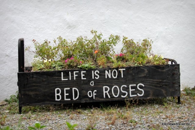 Ein altes Bett ist umfunktioniert zu einem Beet. Darauf steht: „Life is not a bed of Roses“ (Das Leben ist kein Rosenbett). Stimmt.