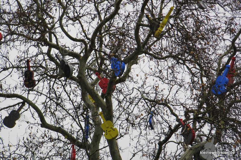 Die Chelli (oder sollen es Geigen sein?)schmücken einen kahlen Baum am Rathausplatz. Schöne Idee, Klassik und moderne Kunst hoch aufzuhängen.