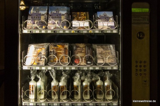 In der Franziskanerkirche entdeckten wir diesen Automaten. Er enthält alles, was man für einen Kirchenbesuch und die Nachbereitung benötigen könnte: Kerzen, CDs mit Orgenmusik, ein Buch über die Kirche usw. anstelle von Süßkram. Super.
