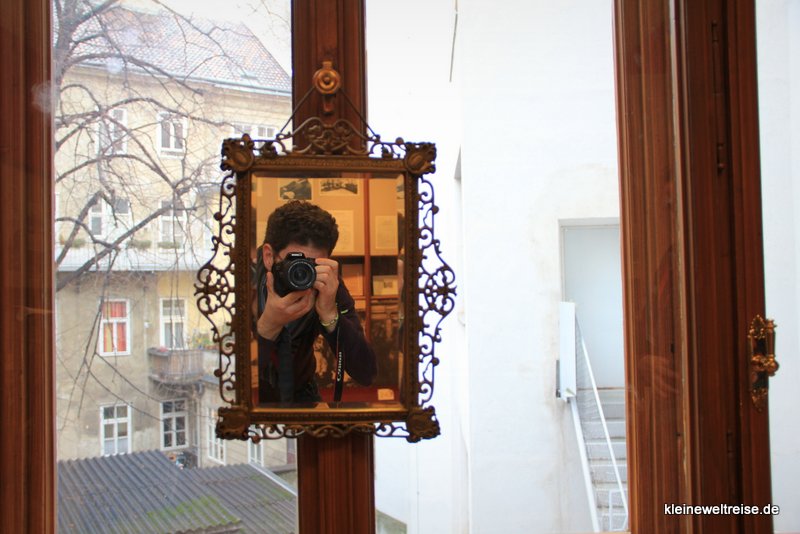 Im alten Arbeitszimmer von Siegmund Freud hängt ein Spiegel, dort wo sein Schreibtisch stand. Darin soll er sich betrachtet haben, jeden Tag, und beobachtete, wie er sich veränderte. Viel von Freud ist in seiner alten Wohnung nicht geblieben, er nahm alles mit sich als er vor den Nazis floh. Hier also sein Spiegel, in dem ich mein erstes fotografisches Selbstporträt seit langem schieße. Irgendwie mag ich den Blick aus dem Fenster, meine Spiegelung und den Gedanken, dass es der Spiegel des Erfinders der Psychoanalyse ist.